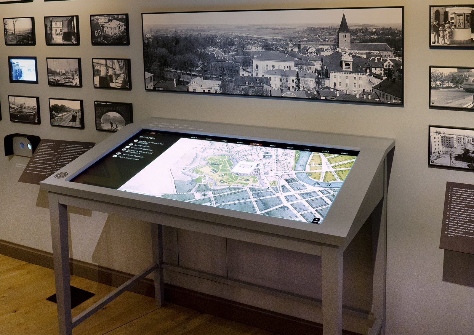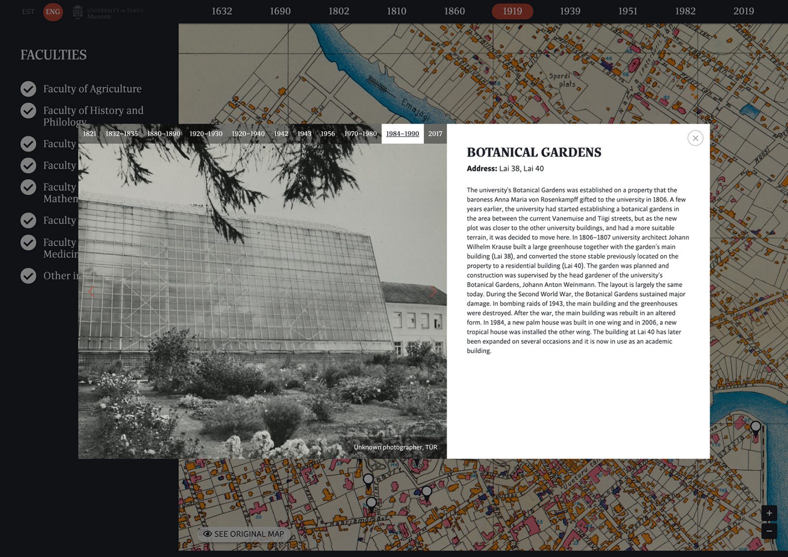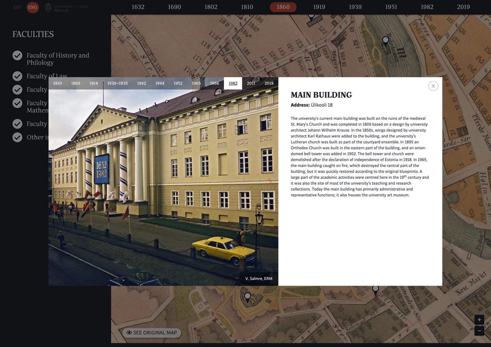 Ülikooli- ja erinevate teaduskondade hoonete esitlemiseks läbi erinevate ajaperioodide kasutasime ajastule omaseid aluskaarte.